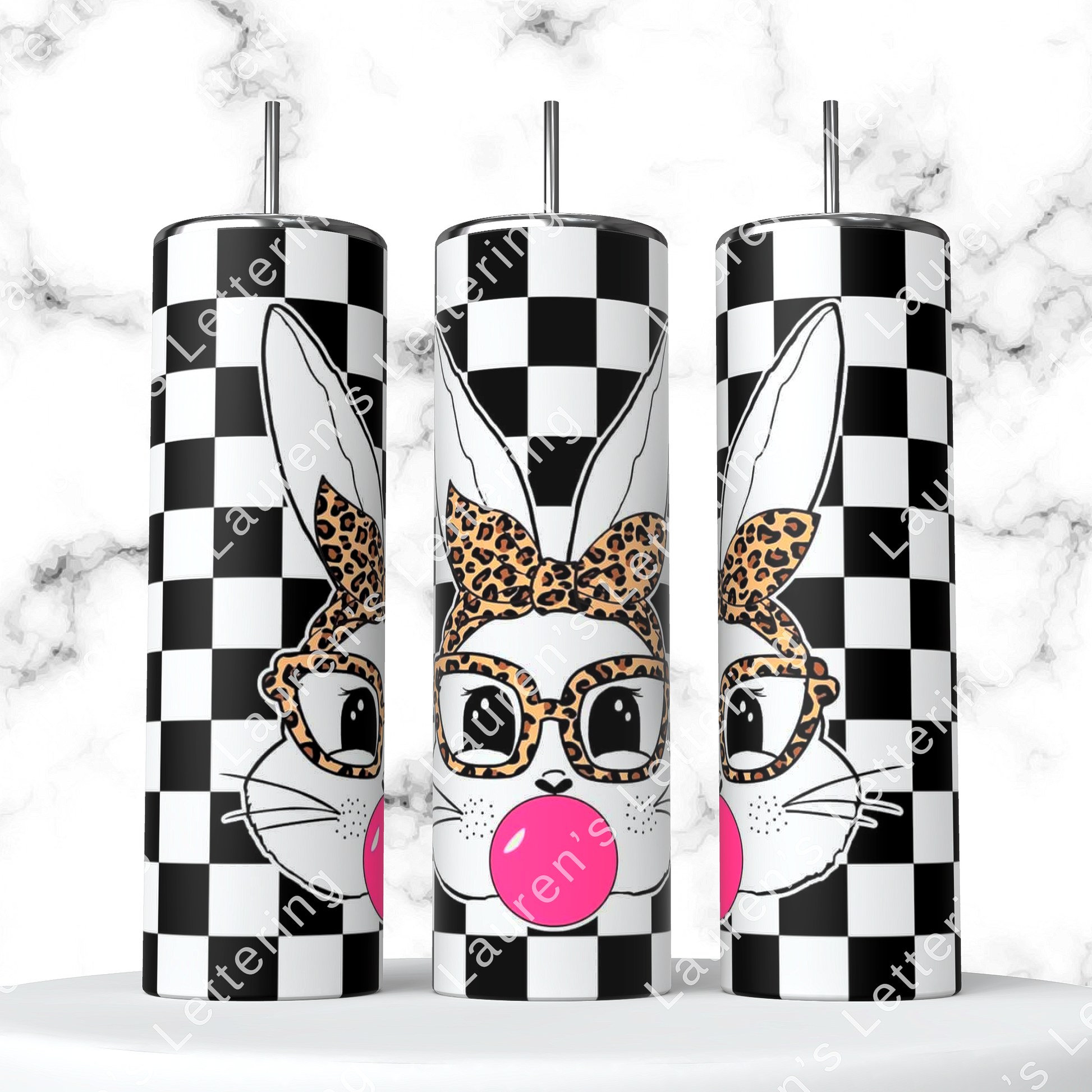 Design: Black and white checkered background with bunny wearing leopard bandana and glasses blowing a bubble