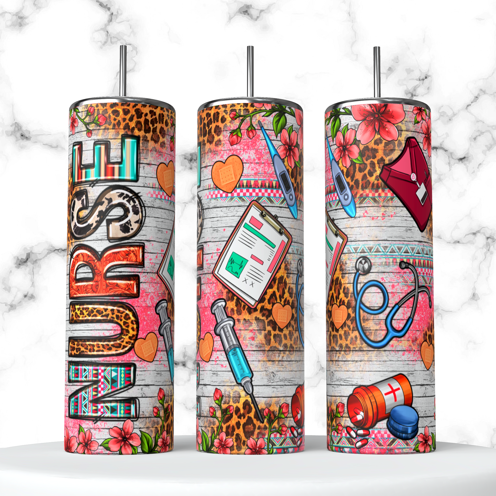 Design: Distressed white background with stripes, leopard print, flowers, hearts and medical gear with the word nurse