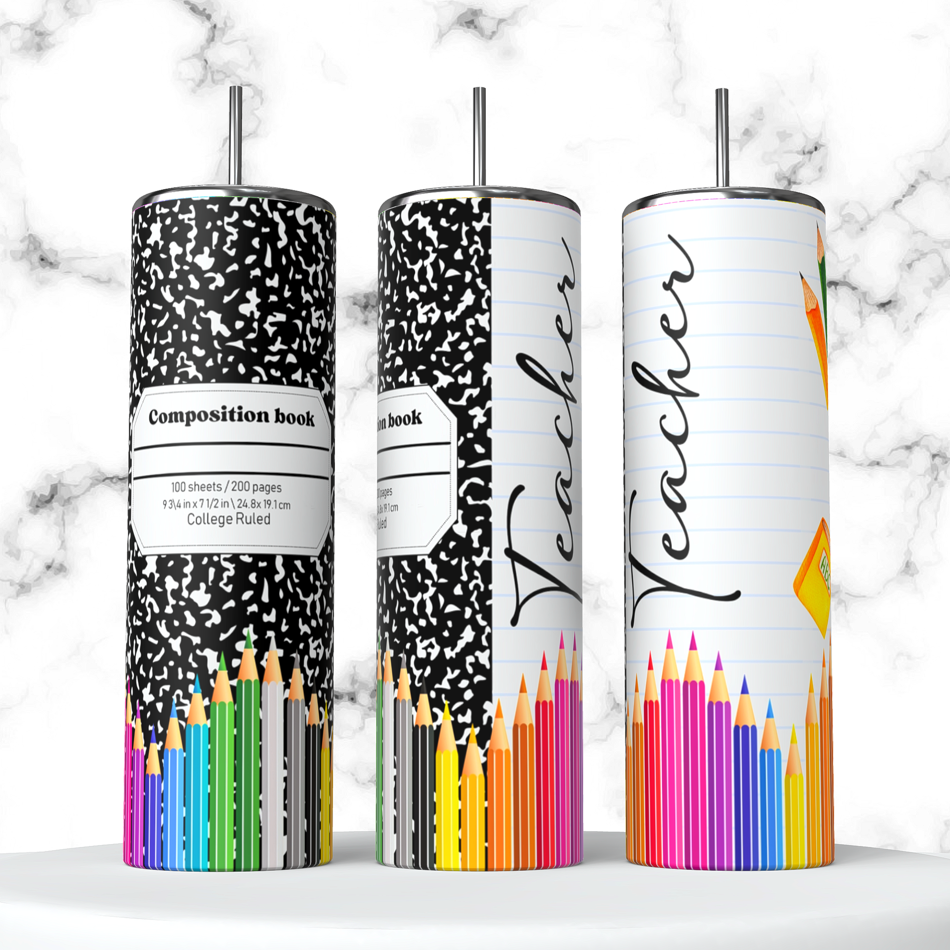 Design: Composition Book with colored pencil bottom border and "teacher" written on notebook paper with supplies