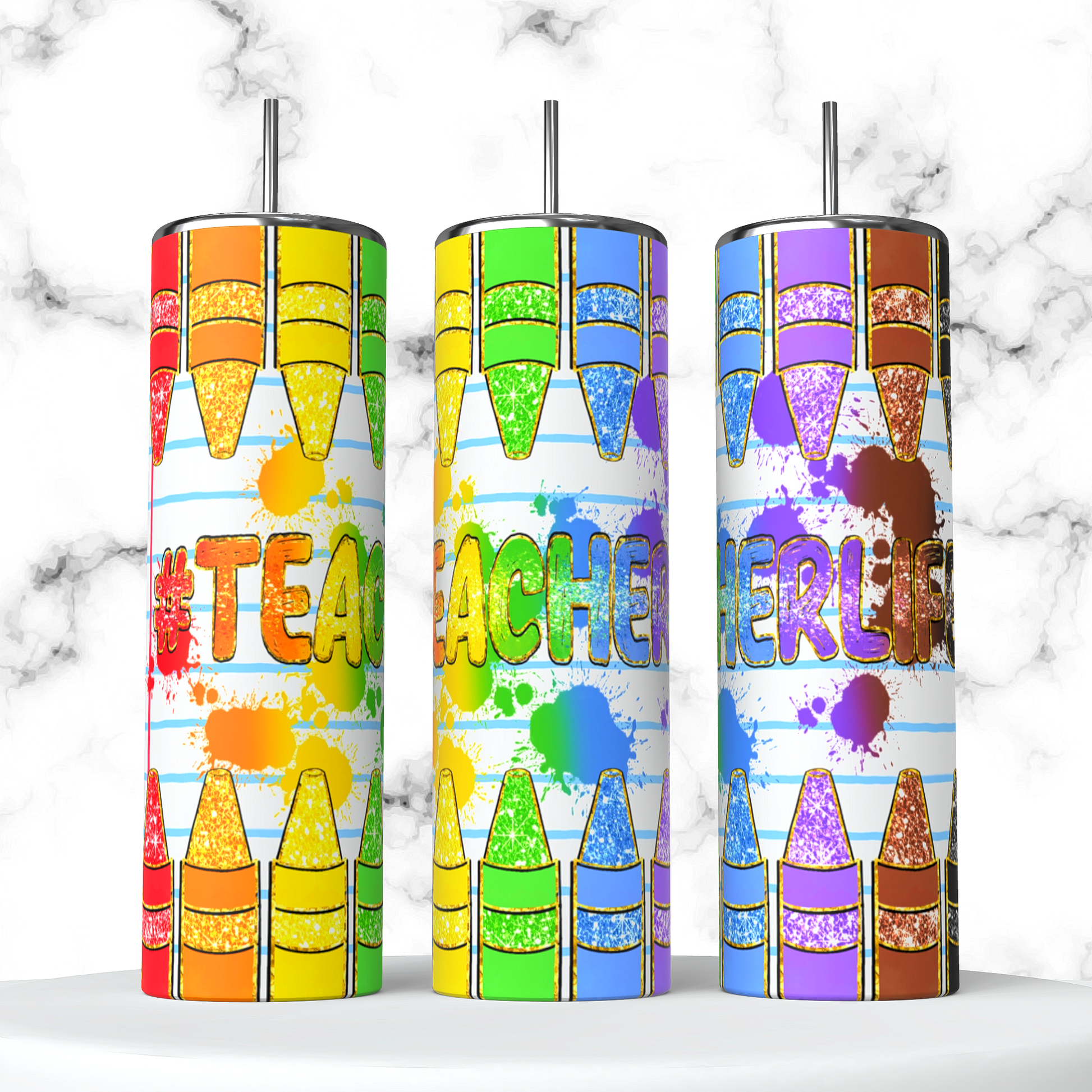 Design: White background resembling notebook paper with crayons around top and bottom rim with colored splatters and the phrase "#teacherlife"